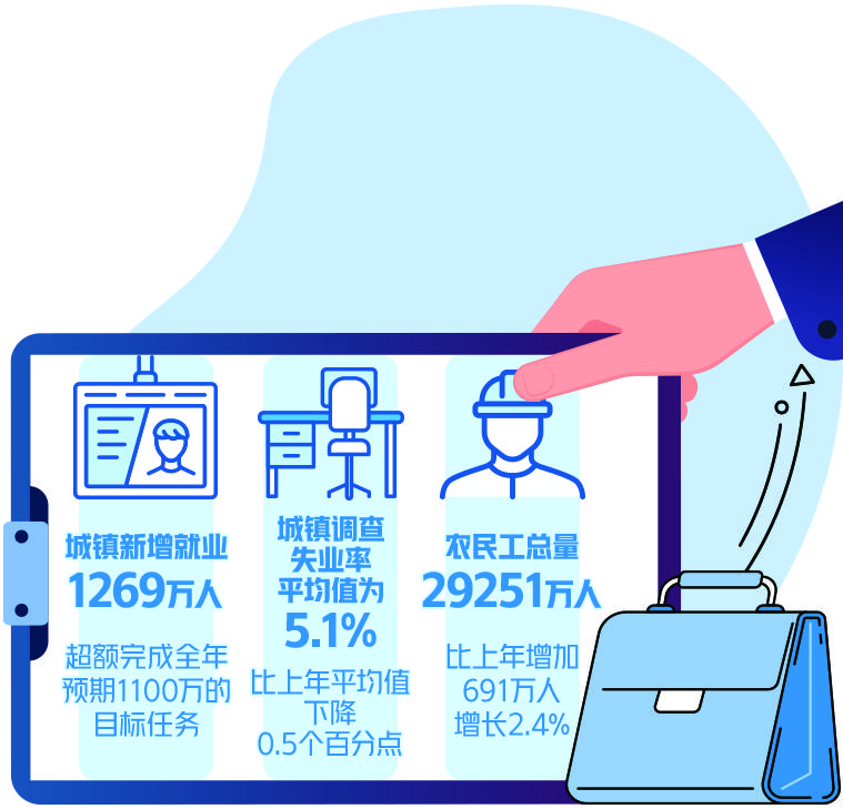 一增,全国城镇新增就业1269万人,超额完成全年预期1100万的目标任务;二减,全年全国城镇调查失业率平均值为5.1%,比上年平均值下降0.5个百分点,去年下半年以来,外来农业户籍人口调查失业率保持在5%以下的较低水平;三升,劳动力市场招聘需求旺盛,求人倍率(岗位空缺与求职人数的比率)始终保持在1以上,短缺职业集中在生活服务和生产制造类等吸纳劳动力较多的行业;四稳,全年农民工总量29251万人,比上年增加691万人,增长2.4%。