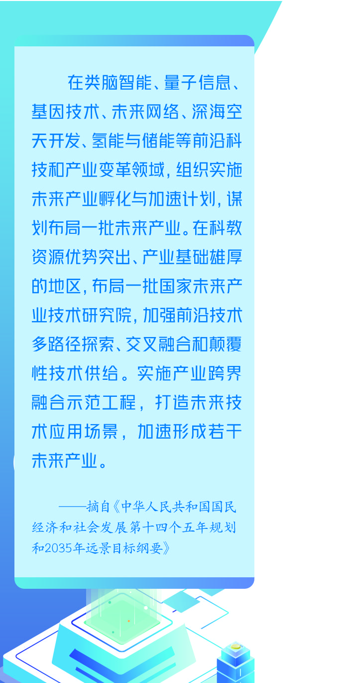 “十四五”规划和2035年远景目标纲要强调要“前瞻谋划未来产业”,要求“组织实施未来产业孵化与加速计划,谋划布局一批未来产业”。未来一个时期,抓紧布局未来产业,大力推进科技创新,是我们着力壮大新增长点、形成发展新动能的重要举措,需多层面、多维度统筹谋划,立足新发展阶段,贯彻新发展理念,培育发展新动能,打造国际竞争新优势,为加快构建现代产业体系、推动经济高质量发展奠定坚实基础。