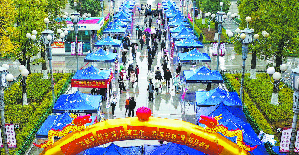 2月8日,湖南省常宁市新春企业招聘会在蒙蒙细雨中举行,吸引了众多求职者前来应聘。当日,该市举行农历虎年首场招聘会,100多家用人单位提供就业岗位超3000个。