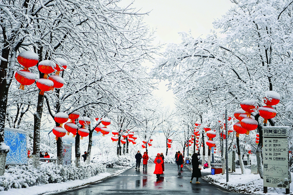 2月7日,湖北襄阳月亮湾公园,市民在玉树琼枝间赏雪拍照。当日,襄阳降下虎年首场瑞雪,处处银装素裹,市民纷纷走到户外,堆雪人、打雪仗、拍美照、赏雪景,享受冰雪带来的快乐。