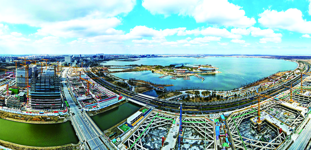 2月10日在中国(上海)自由贸易试验区临港新片区拍摄的滴水湖畔建设工地一景。