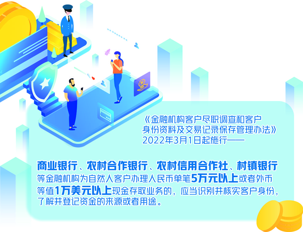 新年伊始,中国人民银行、银保监会、证监会联合印发《金融机构客户尽职调查和客户身份资料及交易记录保存管理办法》,自2022年3月1日起施行。其中,关于个人现金存取的新规引发广泛关注。《办法》提到,商业银行、农村合作银行、农村信用合作社、村镇银行等金融机构为自然人客户办理人民币单笔5万元以上或者外币等值1万美元以上现金存取业务的,应当识别并核实客户身份,了解并登记资金的来源或者用途。对比现行规定可以发现,新规增加了“了解并登记资金的来源或者用途”的要求。