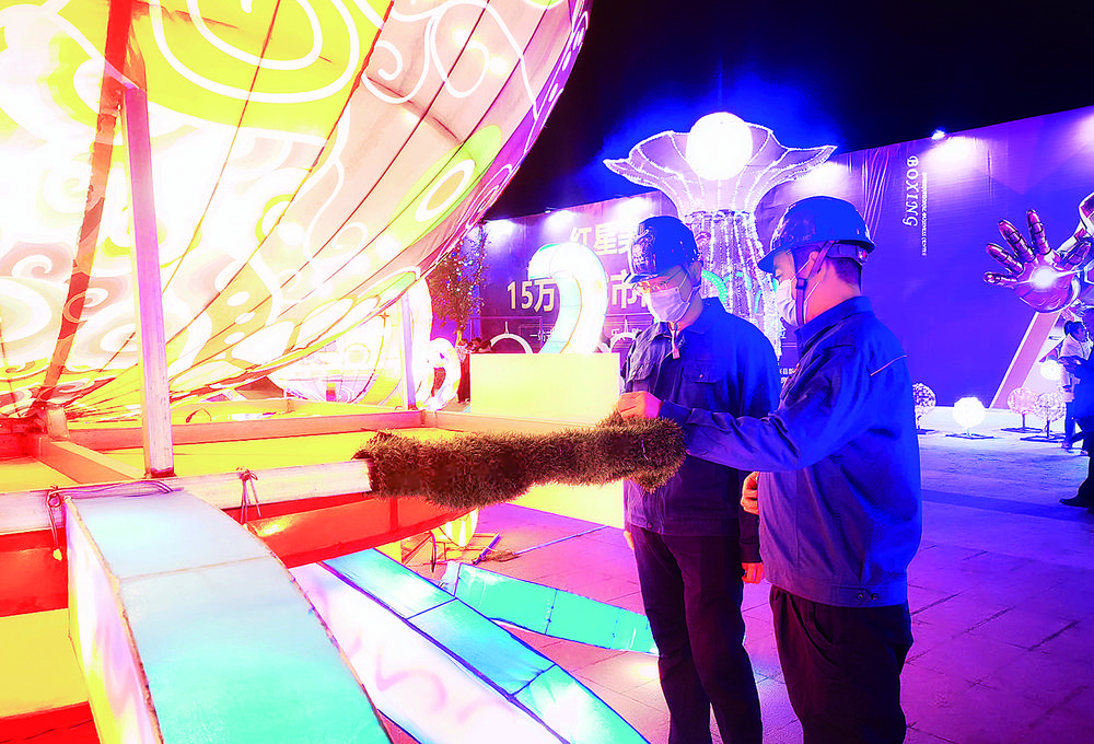 2月12日,山东省博兴县,电力保障人员对元宵节花灯设备进行安全巡检。博兴元宵灯会每年举办,为市民和游客提供了赏灯的好去处,让人们体验传统文化魅力。 王 雪摄(中经视觉)