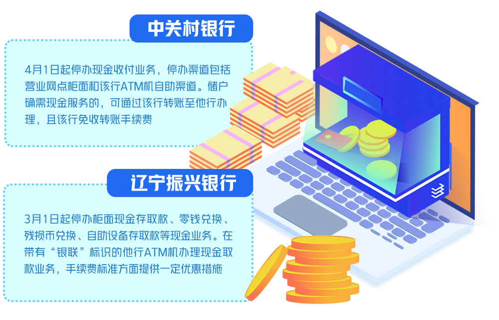 有的银行网点竟然不能办理现金收付业务,假如储户着急取现该怎么办?日前,中关村银行和辽宁振兴银行分别发布公告称,经向有关金融管理部门报备,中关村银行将于4月1日起停办现金收付业务,停办渠道包括营业网点柜面和该行ATM机自助渠道;辽宁振兴银行将于3月1日起停办柜面现金存取款、零钱兑换、残损币兑换、自助设备存取款等现金业务。