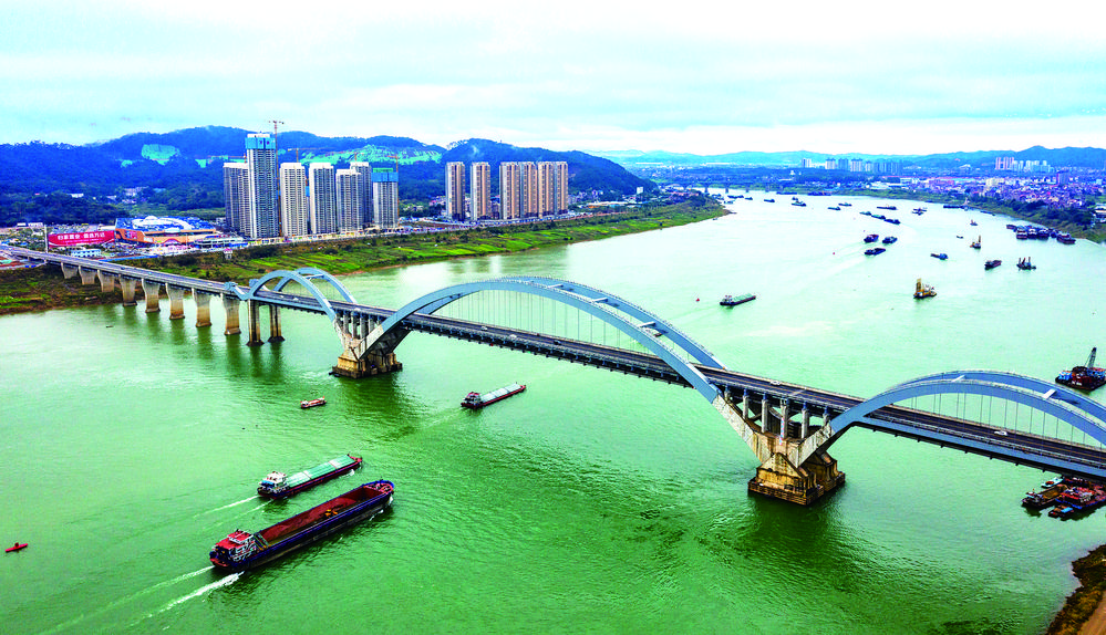 2月13日,无人机航拍广西梧州西江河段。新年伊始,素有“黄金水道”之称的梧州西江河段上,一艘艘满载煤炭、钢材等货物的船舶有序航行,呈现一派繁忙景象。