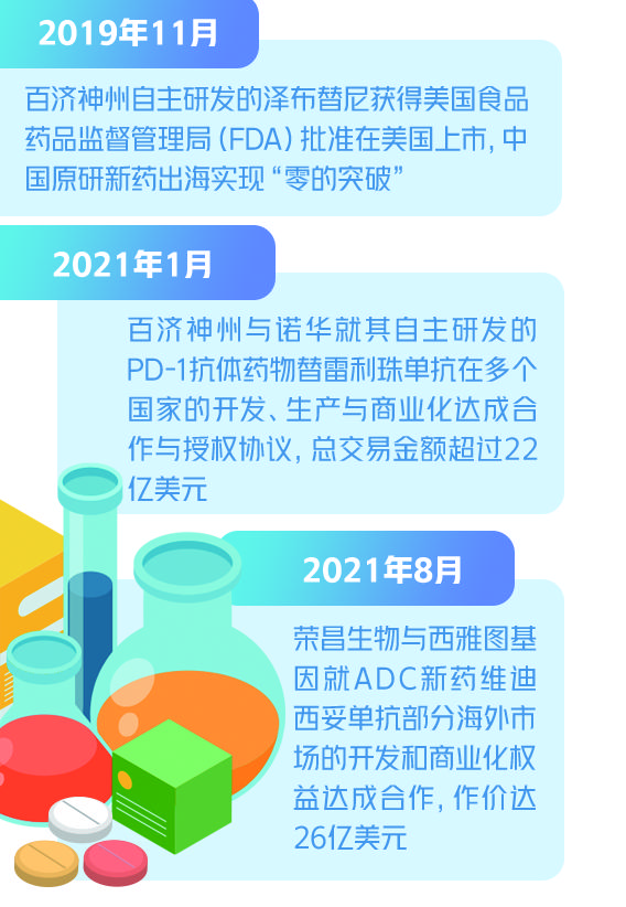 2019年11月,凭借两项关键临床研究的数据,百济神州自主研发的BTK抑制剂——泽布替尼获得美国食品药品监督管理局(FDA)批准在美国上市,中国原研新药出海实现“零的突破”。在出海过程中,百济神州并不“孤单”。恒瑞医药、信达生物等大型药企以及天境生物、亘喜生物等新生力量,都开始布局海外市场。