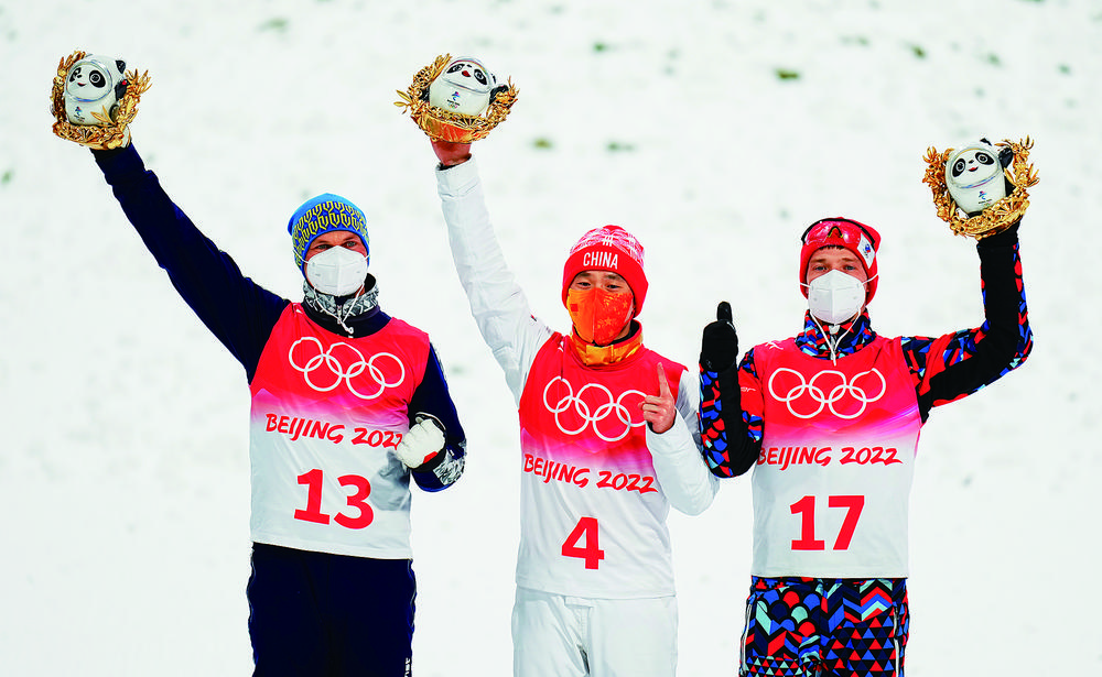 2月16日,冠军中国队选手齐广璞(中)、亚军乌克兰选手亚历山大·阿布拉缅科(左)与季军俄罗斯奥委会选手伊利亚·布罗夫在颁发纪念品仪式上。当日,北京2022年冬奥会自由式滑雪男子空中技巧决赛在张家口赛区举行,中国队选手齐广璞获得冠军,为中国代表团赢得本届冬奥会第七枚金牌。新华社记者 许 畅摄