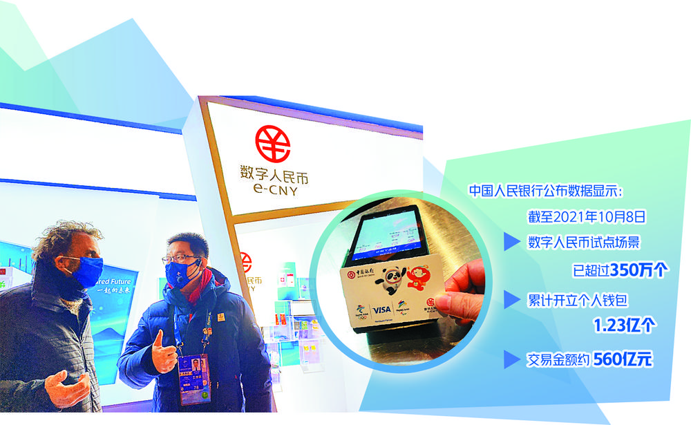 2017年起,人民银行与商业银行、互联网公司等合作,共同进行数字人民币研发。2019年末,数字人民币开始试点,目前,人民银行已经在深圳、苏州、雄安、成都、上海、海南、长沙、西安、青岛、大连等地和2022年北京冬奥会场景开展数字人民币试点。中国人民银行公布的数据显示,截至2021年10月8日,数字人民币试点场景已超过350万个,累计开立个人钱包1.23亿个,交易金额约560亿元。