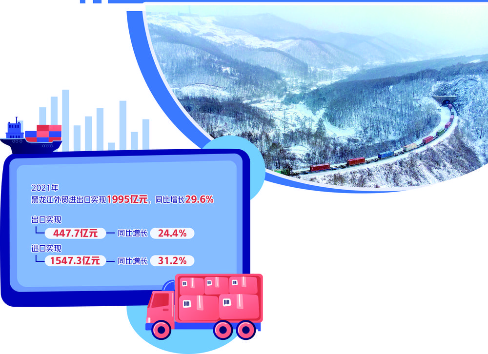 2021年,黑龙江在推进贸易高质量发展上实施务实举措,精准调度服务,外贸进出口实现较好发展。数据显示,2021年1月至12月,黑龙江外贸进出口实现1995亿元,同比增长29.6%。
