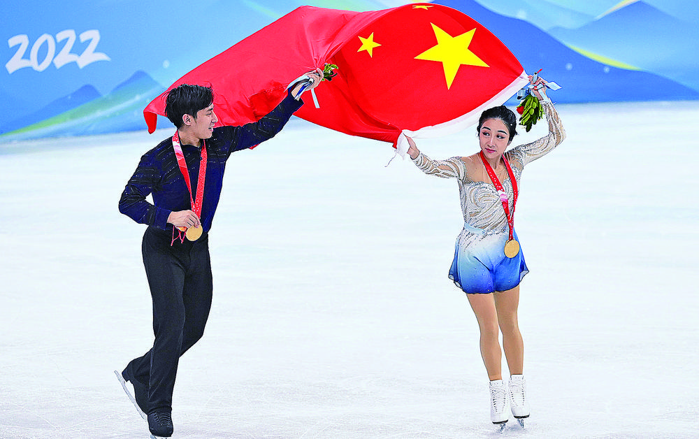 2月19日,中国队选手隋文静(右)/韩聪在奖牌颁发仪式后。当日,北京2022年冬奥会花样滑冰双人滑自由滑比赛在首都体育馆举行,中国队选手隋文静/韩聪夺得双人滑冠军,为中国代表团摘得本届冬奥会第九枚金牌。新华社记者 熊 琦摄