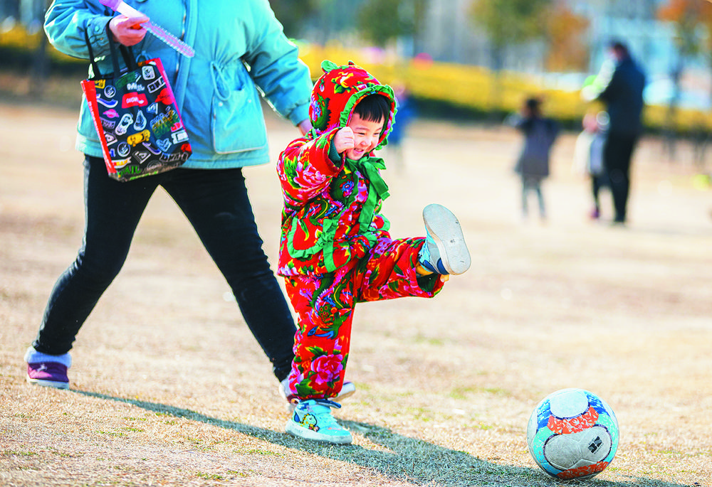 ⑤ 安徽省淮北市东湖湿地公园,孩子在家长陪同下开心地踢足球。