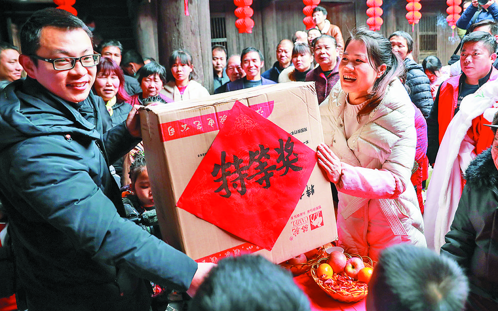 ③ 江西省吉水县尚贤乡桥头古村,干部群众开展丰富多彩的文体活动,并给优胜者奖励。