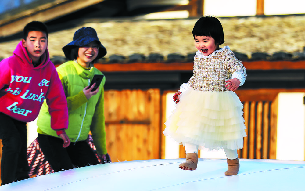 ④ 福建省福州市仓山区梁厝历史文化街区,孩子们在蹦蹦云游乐项目上玩耍。