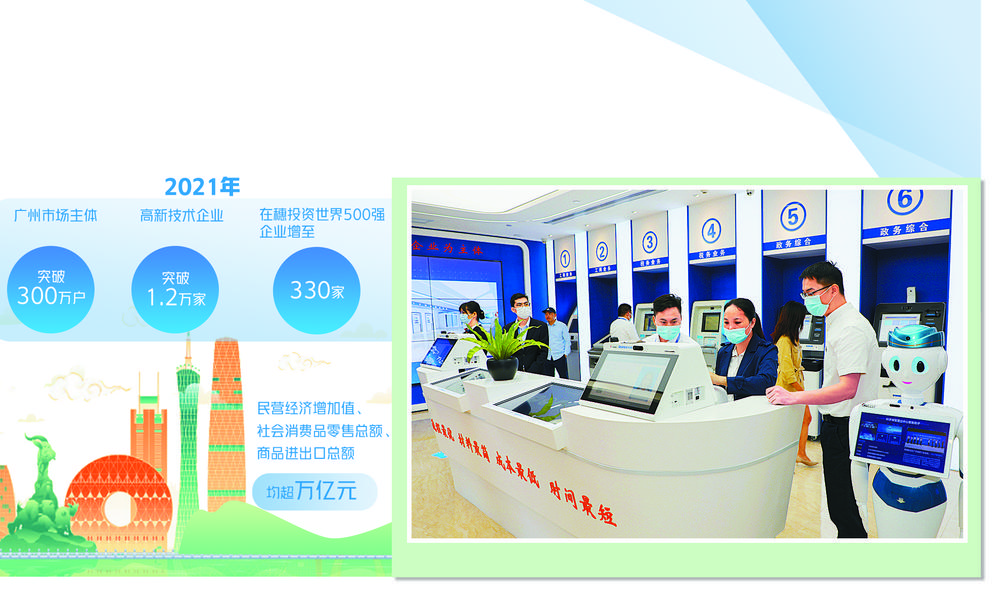 不断向好的营商环境有力激发着市场主体和城市经济活力。数据显示,2021年,广州市场主体突破300万户,高新技术企业突破1.2万家,在穗投资世界500强企业增至330家。广州民营经济增加值、社会消费品零售总额、商品进出口总额均超万亿元。但日渐激烈的区域经济竞争也对广州营商环境提出了新的要求。