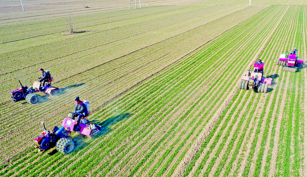 2月21日,在山东省聊城市茌平区贾寨镇贾寨后村田间,农民驾驶着麦田镇压机进行麦田镇压保墒作业,全面加强冬小麦春季田间管理,为小麦稳产增产提供坚实的科技保障。