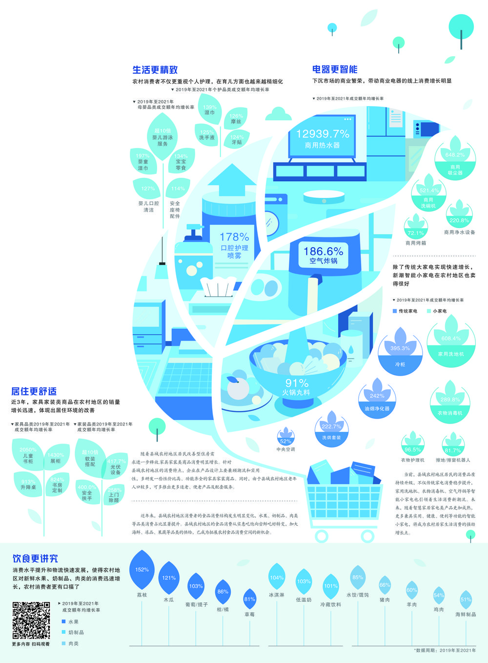 此外,随着县域农村地区教育水平和收入的提升,新一代农村父母更注重育儿产品品质与精细化,并且对自身护理标准不断升级。数据显示,近3年县域农村地区个人护理、母婴育儿等商品销售增速显著提升。