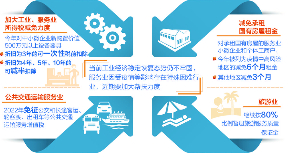 减税降费体现出明显的针对性、精准性。从总体部署看,今年要延续实施2021年底到期的支持小微企业和个体工商户的减税降费措施;完善研发费用加计扣除政策,加大增值税留抵退税力度,促进制造业企业科技创新和更新改造;针对受疫情影响重、就业容量大的服务业等特殊困难行业,研究精准帮扶的减税降费措施。近日,国务院常务会议确定促进工业经济平稳增长和服务业特殊困难行业纾困发展的措施,其中首要的就是减税降费,包括加大工业、服务业所得税减免力度,今年对中小微企业新购置价值500万元以上设备器具,折旧为3年的可一次性税前扣除,折旧为4年、5年、10年的可减半扣除;延长制造业中小微企业缓税政策;扩大地方“六税两费”减免政策适用主体范围至全部小型微利企业和个体工商户。
