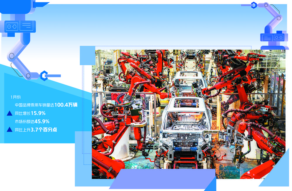 中汽协数据显示,2021年全年,中国品牌乘用车销量达到了954.3万辆,同比增长23.1%,市场份额达到了44.4%,同比提高了6个百分点。增长势头在今年得以延续,1月,中国品牌乘用车销量达100.4万辆,同比增长15.9%,市场份额达到45.9%,同比上升了3.7个百分点。