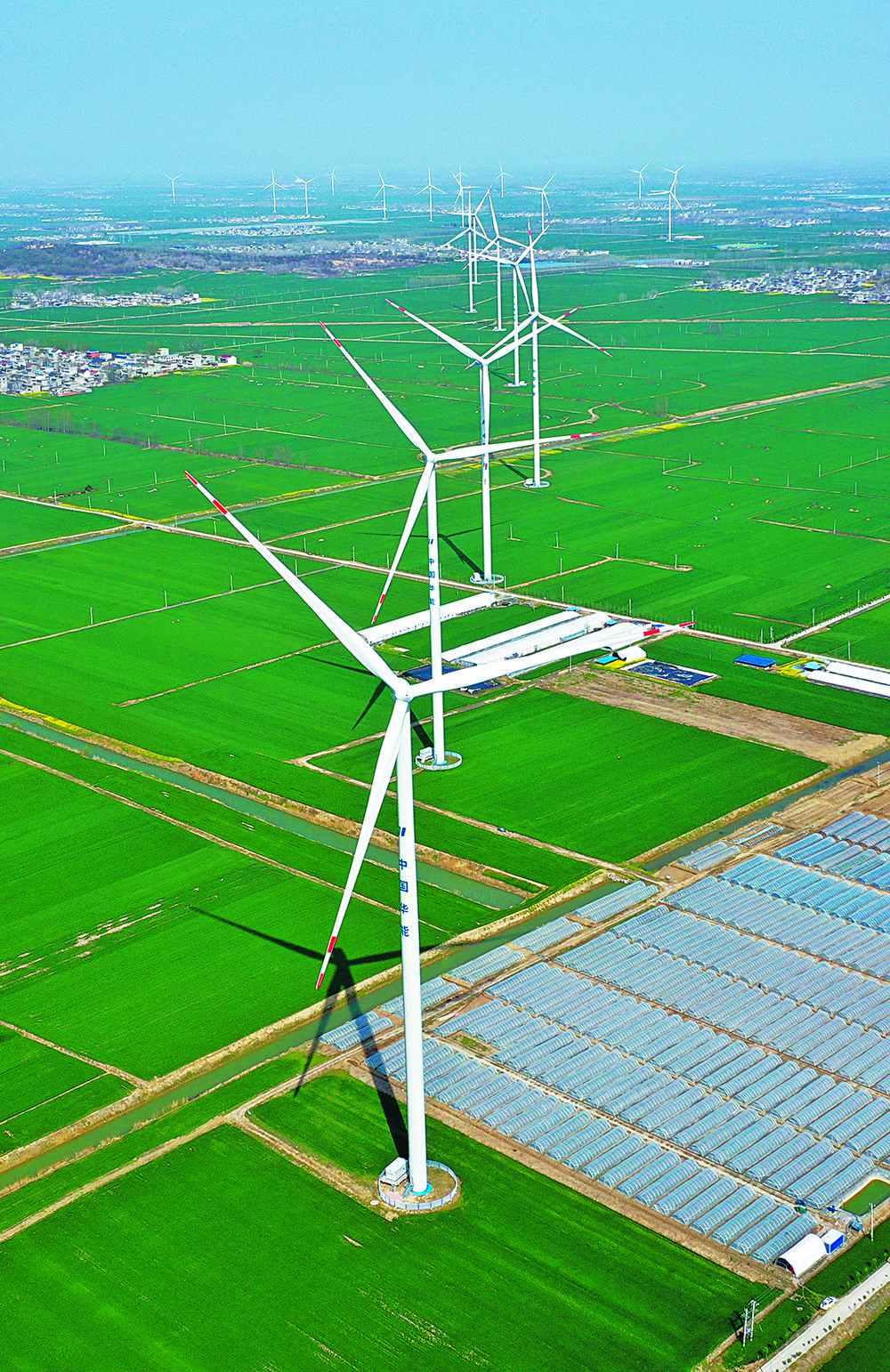 三月二十八日,安徽省蒙城县小涧镇风电机组与田园春色融为一体。近年来,当地大力推进清洁低碳能源建设,建成风电并网装机规模四十余万千瓦,年减少二氧化碳排放近百万吨。胡卫国摄(中经视觉)