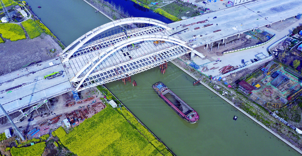 4月4日,江苏省扬州市宝应县东阳路跨宝射河大桥建设现场,工人们正在抓紧施工作业。该大桥建设工程全长857米,总投资约2.6亿元,预计今年8月份建成通车。