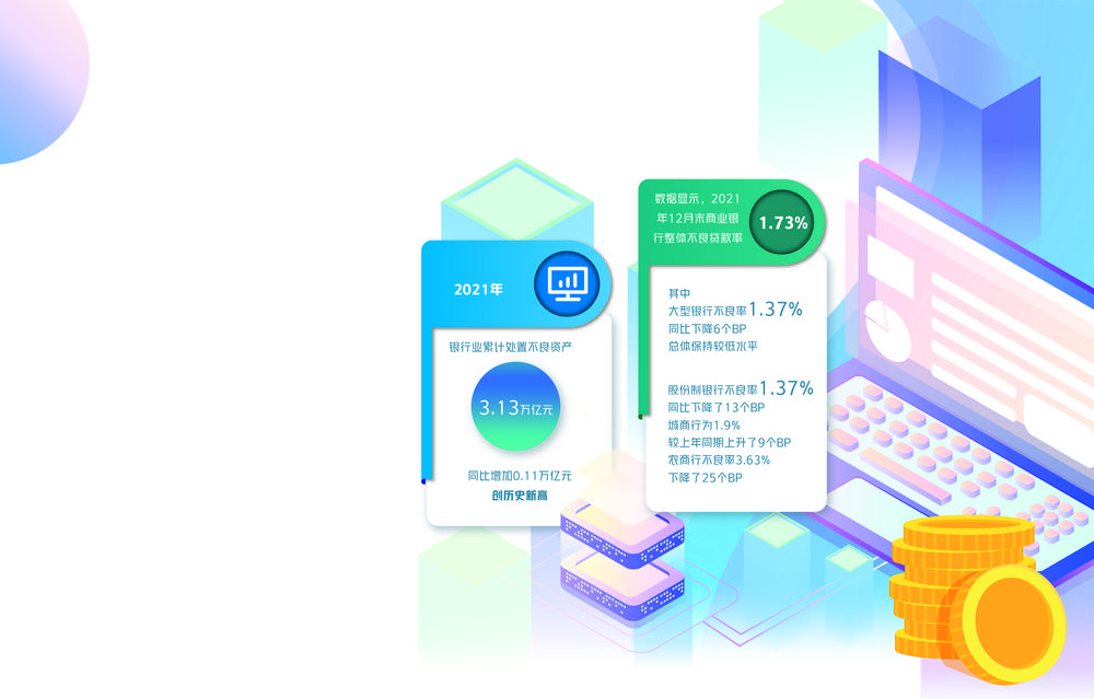 2021年,银行业累计处置不良资产3.13万亿元,同比增加0.11万亿元,创历史新高,有效降低了信用风险水平,为守住不发生系统性风险底线提供了重要保障。但应看到,银行不良贷款率还存在压降空间。银保监会2022年工作会议提出,支持加快不良资产处置。数据显示,2021年12月末商业银行整体不良贷款率1.73%。其中,大型银行不良率1.37%,同比下降6个BP,总体保持较低水平;股份制银行不良率1.37%,同比下降了13个BP,城商行不良率是1.9%,较上年同期上升了9个BP,农商行不良率3.63%,下降了25个BP。