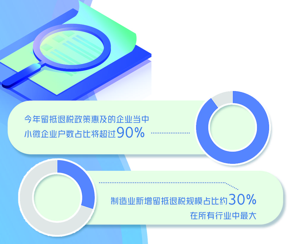 在政策覆盖范围上,既全面覆盖小微企业,又重点突出六大行业。今年留抵退税政策惠及的企业当中,小微企业户数占比将超过90%;制造业新增留抵退税规模占比约30%,在所有行业中最大。通过聚焦国民经济运行和产业链、供应链中的重点及关键环节,精准释放退税红利和改革效应。