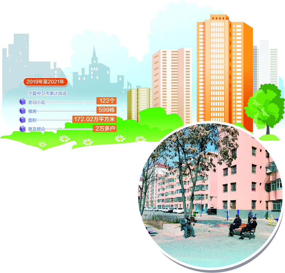 近日,记者走进宁夏中卫市沙坡头区文昌阁小区,这里道路整洁,环境宜人,楼宇亮丽。一群老人在小区广场上的长椅上沐浴春阳,十分惬意。“小区变化太大了!改造前,广场这边是废旧厂房。跟过去比,简直就像换了个新小区。”73岁的朱广存感叹地说。