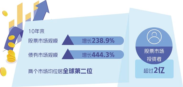 我国资本市场近年来体系包容性大幅提升,投融资功能显著增强,良性市场生态逐步形成。10年来,股票市场规模增长238.9%,债券市场规模增长444.3%,两个市场均位居全球第二位。股票市场投资者超过2亿。日前,中国证券监督管理委员会副主席李超出席中宣部“中国这十年”系列主题新闻发布会时作上述介绍。