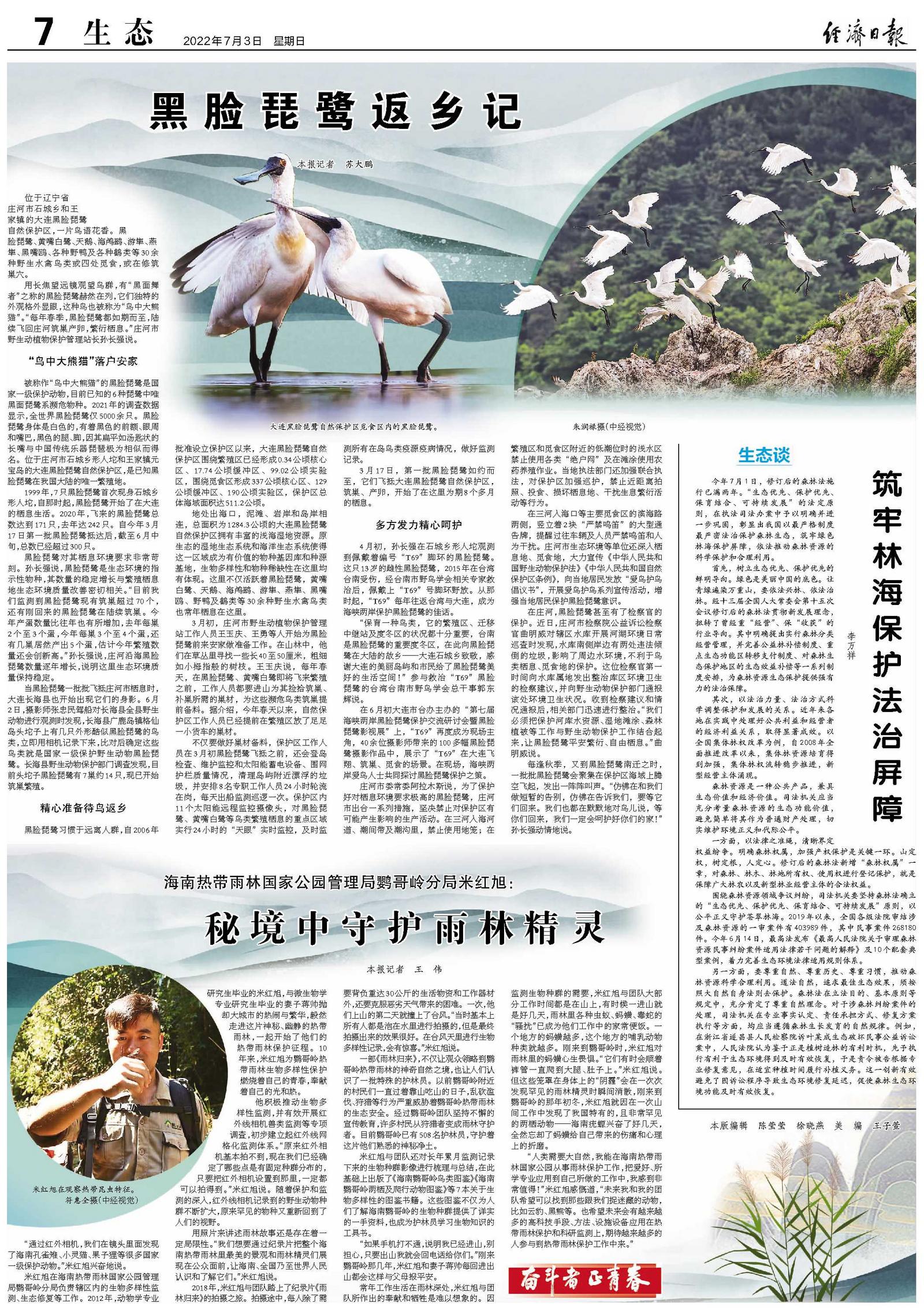 用长焦望远镜观望鸟群,有“黑面舞者”之称的黑脸琵鹭赫然在列,它们独特的外观格外显眼,这种鸟也被称为“鸟中大熊猫”。“每年春季,黑脸琵鹭都如期而至,陆续飞回庄河筑巢产卵,繁衍栖息。”庄河市野生动植物保护管理站长孙长强说。