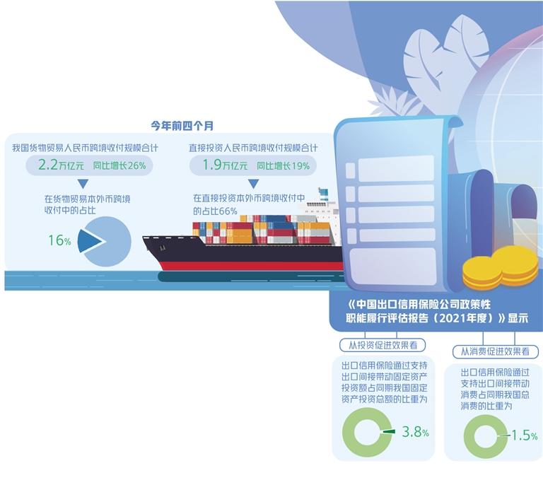 今年前四个月,我国货物贸易人民币跨境收付规模合计2.2万亿元,同比增长26%,在货物贸易本外币跨境收付中的占比16%,较去年末提升1.3个百分点;直接投资人民币跨境收付规模合计1.9万亿元,同比增长19%,在直接投资本外币跨境收付中的占比66%。