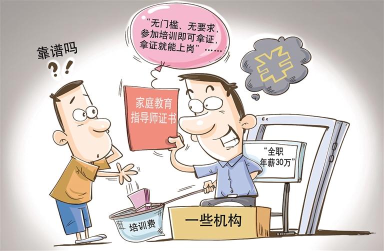 一段时间以来,家庭教育指导师的培训广告频频出现在部分线上平台,吸引了不少人参加培训考证。一些机构的培训项目收费几千元,但课程内容多为七拼八凑,不但毫无系统性,课程质量也不高,号称“年薪30万”的就业更是难以实现。去年年底,人社部公布新版国家职业资格目录,家庭教育指导师并未入列其中。虽然近期“家庭教育指导师”被列为18个新职业之一,但仍需经征求意见、修改完善后,才将被纳入新版职业分类大典。人社部曾发文要求,目录之外一律不得许可和认定职业资格,目录之内除准入类职业资格外一律不得与就业创业挂钩。对此,求职者应提高辨别意识,切莫轻信“培训考证即可带来高薪工作”。(时 锋)