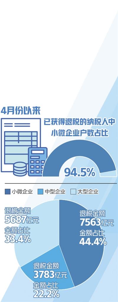 统计显示,中小微企业、个体工商户是留抵退税政策的主要受益群体。4月以来,已获得退税的纳税人中,小微企业户数占比94.5%,共计退税7563亿元,金额占比44.4%;中型企业退税3783亿元,大型企业退税5687亿元,金额分别占比22.2%、33.4%。