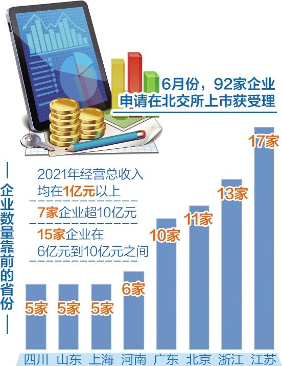 6月份北交所受理企业主要来自20个省份,企业数量靠前的省份有:江苏(17家)、浙江(13家)、北京(11家)、广东(10家)、河南(6家)、上海(5家)、山东(5家)和四川(5家)。
