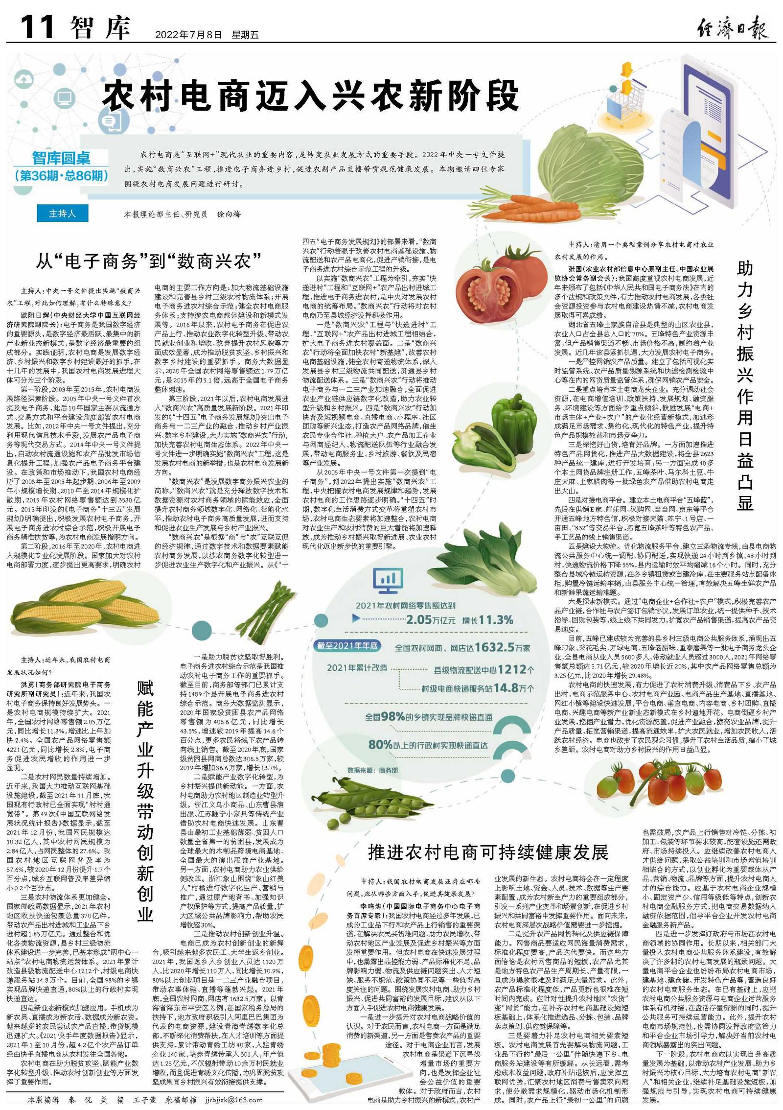 李鸣涛(中国国际电子商务中心电子商务首席专家):我国农村电商经过多年发展,已成为工业品下行和农产品上行销售的重要渠道,在解决农民买货难问题、助力农民增收、带动农村地区产业发展及促进乡村振兴等方面发挥重要作用。但农村电商在快速发展过程中,也暴露出品控能力弱、产品标准化不足、品牌影响力弱、物流及供应链问题突出、人才短缺、服务不规范、政策协同不足等一些值得高度关注的问题。围绕发展农村电商、助力乡村振兴、促进共同富裕的发展目标,建议从以下方面入手促进农村电商健康发展。