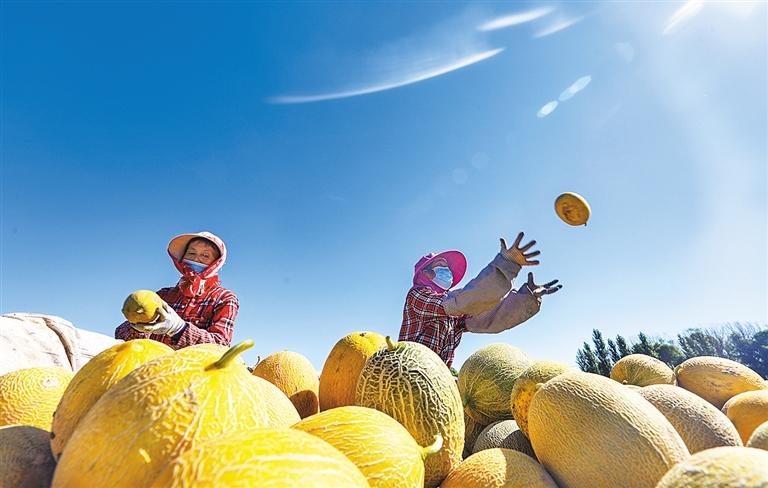 ▲新疆呼图壁县园户村镇马场湖村,村民在收获甜瓜。该县积极培育特色产业,引导农民向高效农业发展,助力乡村振兴。王俊伟摄(中经视觉)