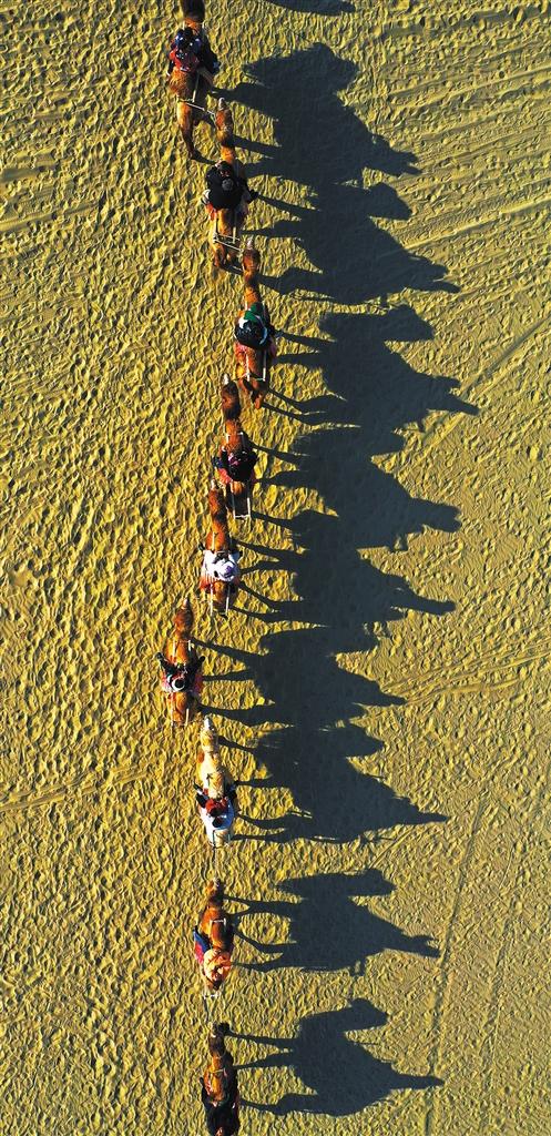◀游客在新疆生产建设兵团一师阿拉尔市沙漠之门景区骑骆驼游玩。一师阿拉尔市发挥资源优势,着力打造沙漠特色文化旅游品牌。王志清摄(中经视觉)