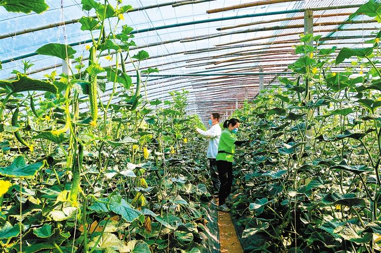 7月7日,山东冠县贾镇许家村的农户在大棚管护蔬菜。围绕推动乡村振兴,当地整合涉农财政资金,通过村党支部领办合作社方式发展高标准蔬菜大棚,种植无公害蔬菜,不断壮大村集体经济。王 琨摄(中经视觉)
