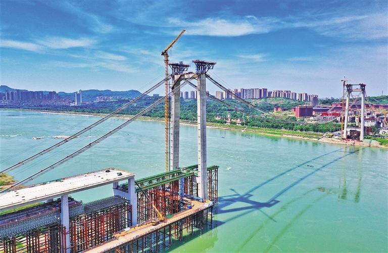 7月12日,位于四川省泸州市的长江二桥施工现场,两根布设主缆宛若“凌空天梯”。该桥为双塔单跨重力式悬索桥,主跨长576米,边跨长216米。大桥建成后,将成为泸州入城的快速通道,促进地区经济社会发展。杨尚威摄(中经视觉)