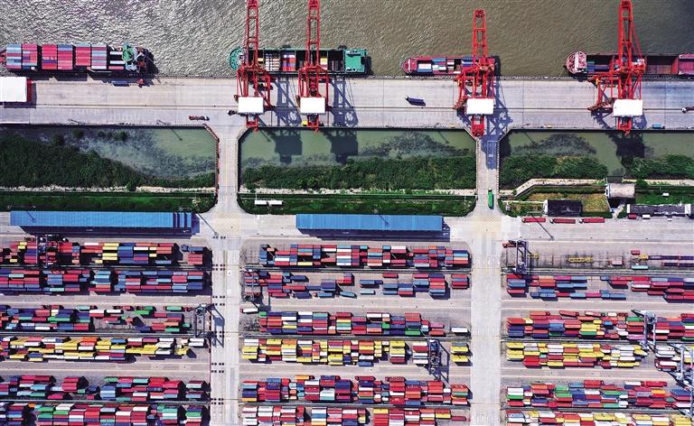 7月13日,俯瞰江苏省港口集团南京港龙潭集装箱有限公司港口。连日来,该港口昼夜不停忙生产,全力以赴保障港口物流稳定畅通。