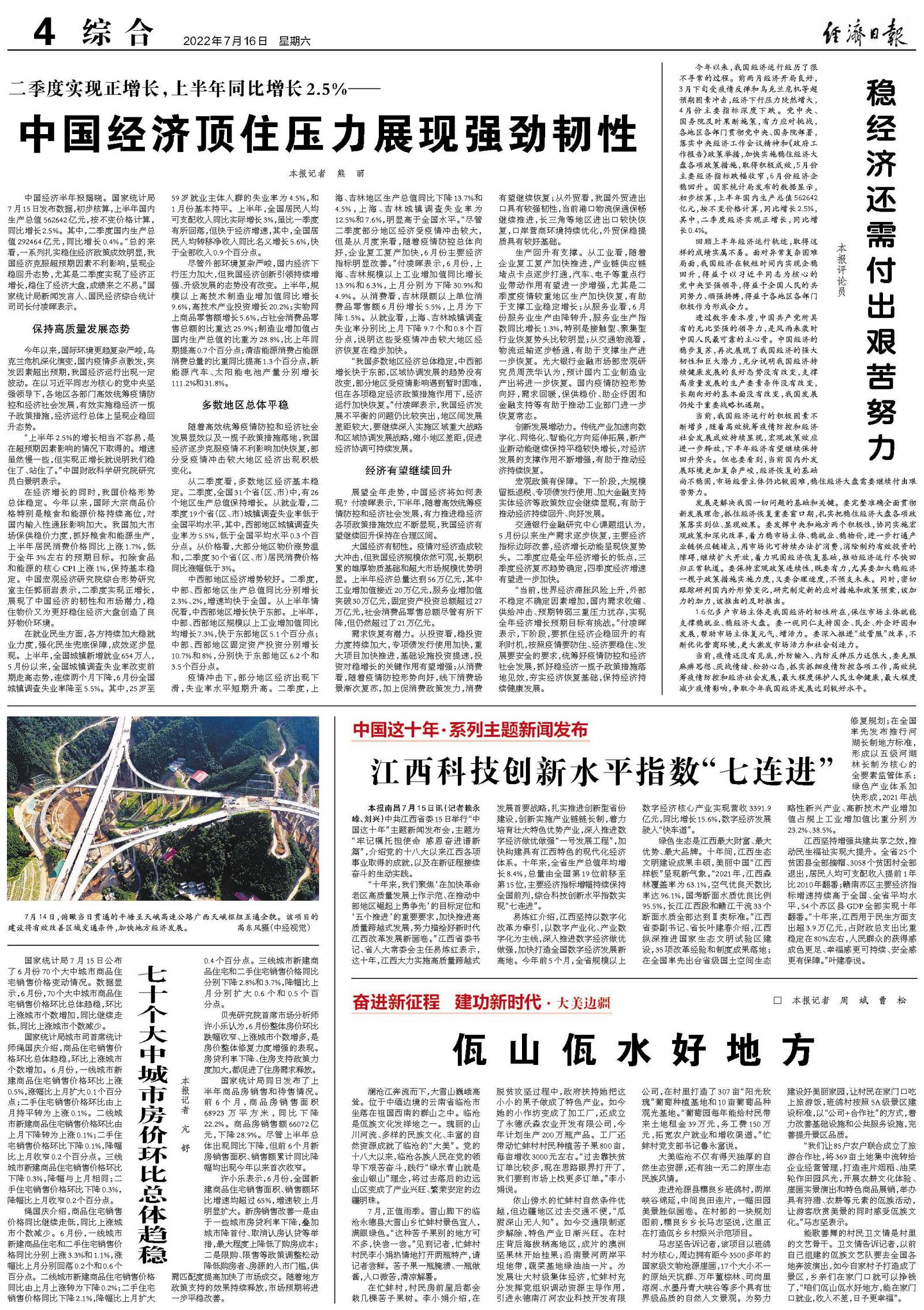 今年以来,我国经济运行经历了很不寻常的过程。前两月经济开局良好,3月下旬受疫情反弹和乌克兰危机等超预期因素冲击,经济下行压力陡然增大,4月份主要指标深度下跌。党中央、国务院及时果断施策,有力应对挑战,各地区各部门贯彻党中央、国务院部署,落实中央经济工作会议精神和《政府工作报告》政策举措,加快实施稳住经济大盘各项政策措施,取得积极成效,5月份主要经济指标跌幅收窄,6月份经济企稳回升。国家统计局发布的数据显示,初步核算,上半年国内生产总值562642亿元,按不变价格计算,同比增长2.5%,其中,二季度经济实现正增长,同比增长0.4%。