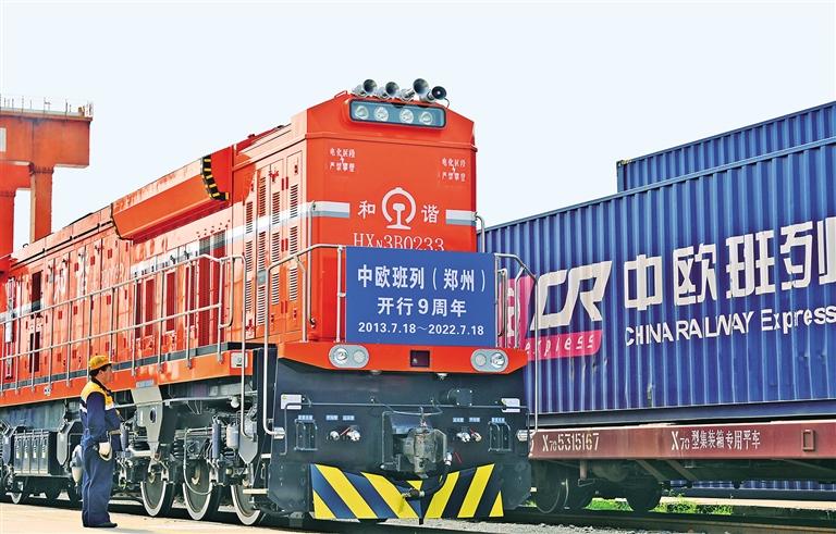 7月18日,75175次中欧班列在河南郑州圃田站等待发车。当日,中欧班列(郑州)迎来开行九周年,累计开行列数突破6000列,1800余种河南制造商品搭上中欧班列迈出国门。王 玮摄(中经视觉)
