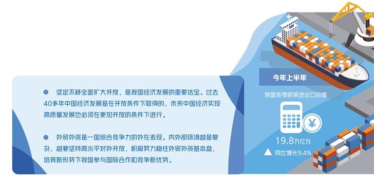 坚定不移全面扩大开放,是我国经济发展的重要法宝。历史告诉我们,封闭最终只能走进死胡同,只有开放合作,道路才能越走越宽。当前,受逆全球化思潮抬头、全球价值链重构、国际经贸规则调整以及新冠肺炎疫情等影响,我国外贸外资发展外部环境更加复杂。同时,我国正处于转变发展方式、优化经济结构、转换增长动力的攻关期,结构性、体制性、周期性问题相互交织,稳外贸压力显著增加,稳外资也面临诸多挑战。外贸是一国综合竞争力的外在表现,外资是一国联通内外市场和资源的重要纽带。内外部环境越是复杂,越要坚持高水平对外开放,积极努力稳住外贸外资基本盘,抓住当前存在的关键问题,培育新形势下我国参与国际合作和竞争新优势。