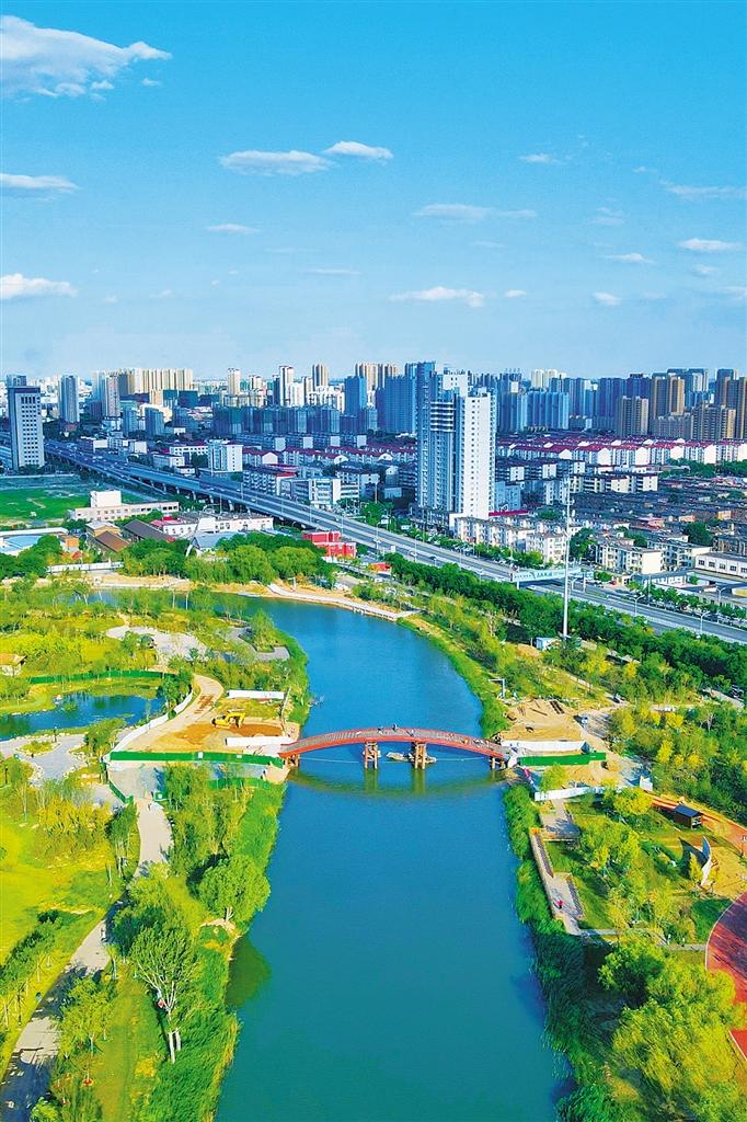 7月21日,俯瞰建设中的京杭大运河生态廊道。由中铁二十二局建设的京杭大运河沧州段代家园码头完成铺装,标志着沧州段生态廊道的码头全部建成,为京杭大运河沧州城区段恢复通航奠定基础。翟杉杉摄(中经视觉)