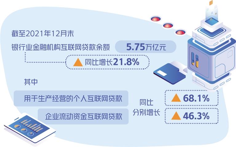 近年来,互联网贷款业务快速发展,在服务实体经济方面发挥了重要作用。“作为传统线下贷款的重要补充,互联网贷款能够更便捷地满足企业、居民的合理融资需求,有利于支持实体经济发展,有利于不断提高金融便利度和普惠覆盖面。”中国银保监会相关负责人说。尤其在新冠肺炎疫情防控的背景下,互联网贷款可以触达传统金融渠道难以覆盖的客户群体。据监管部门统计,截至2021年12月末,银行业金融机构互联网贷款余额为5.75万亿元,同比增长21.8%,其中用于生产经营的个人互联网贷款、企业流动资金互联网贷款同比分别增长68.1%、46.3%。