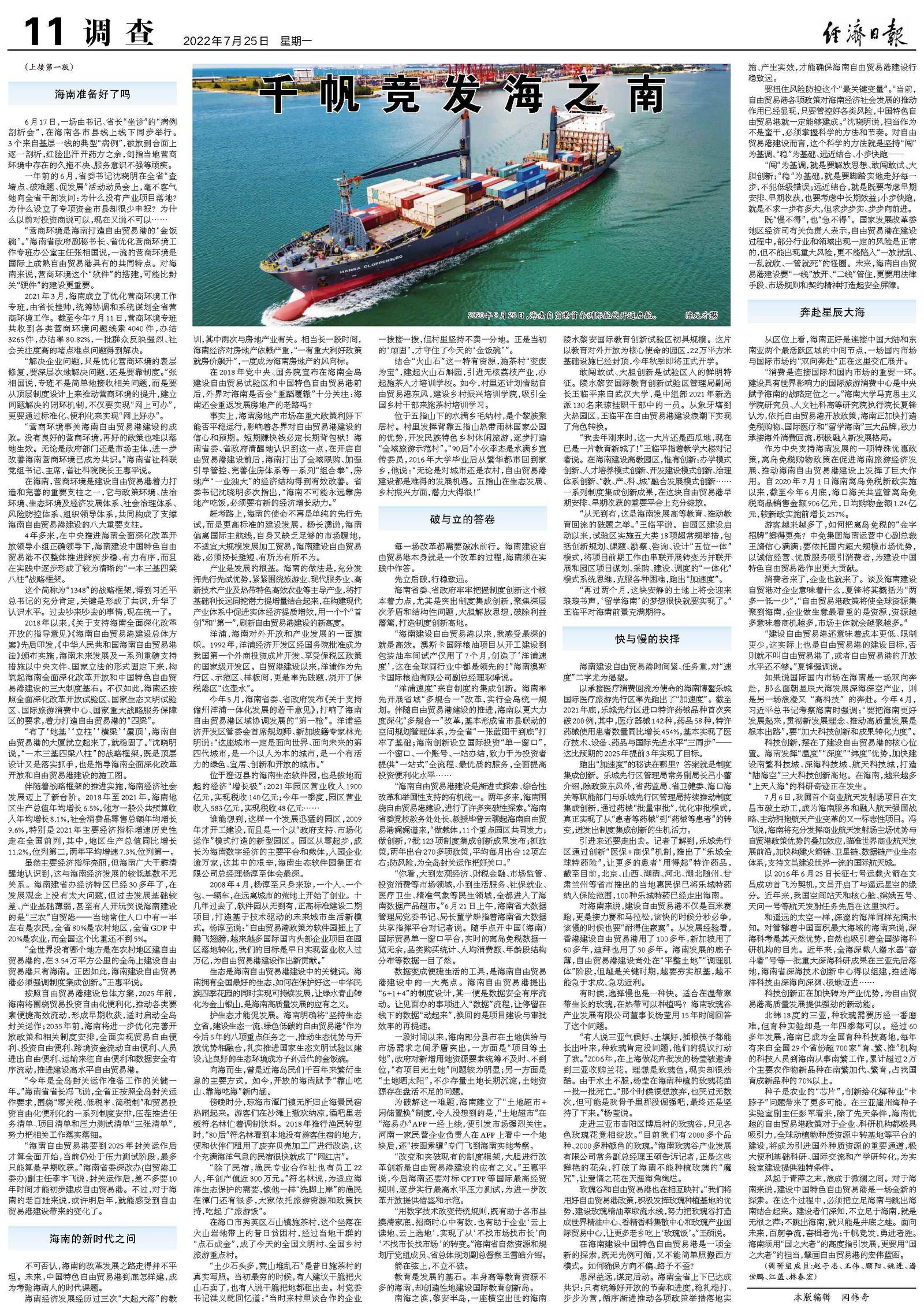 “离2025年全岛封关运作还有2年多时间,我们必须与时间赛跑!”采访中,海南干部群众开拓创新、真抓实干的劲头令人印象深刻,他们用行动证明“海南自由贸易港是全世界的机会,也是每一个人的机会”,他们还将用更多的行动证明“社会主义不仅能建设自由贸易港,而且能建设得更好!”