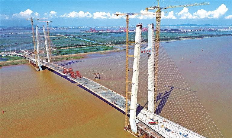 7月25日,由铁四院设计、中铁十八局集团承建的粤港澳大湾区重点交通项目——广州南沙自贸区红莲大桥实现主桥合龙。大桥计划于今年底建成,届时,南沙自贸区龙穴岛国际航运物流交易中心与岛外行车时间将由目前的45分钟缩短至10分钟以内。丁 迪摄(中经视觉)
