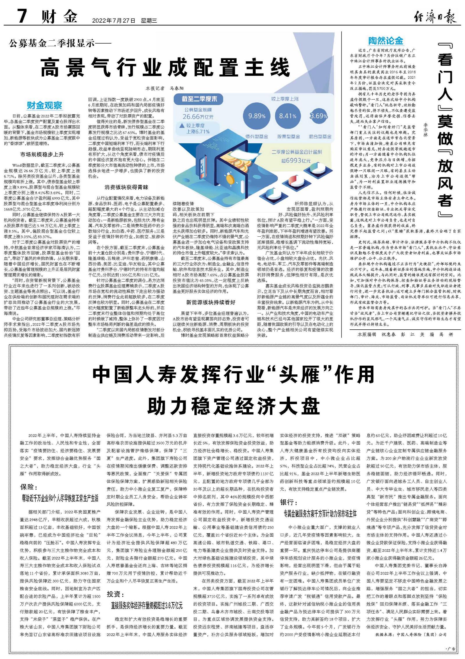 2022年上半年,中国人寿持续坚持金融工作的政治性、人民性和专业性,全面落实“疫情要防住、经济要稳住、发展要安全”要求,发挥综合金融优势服务“国之大者”,助力稳定经济大盘,行业“头雁”作用取得新成效。