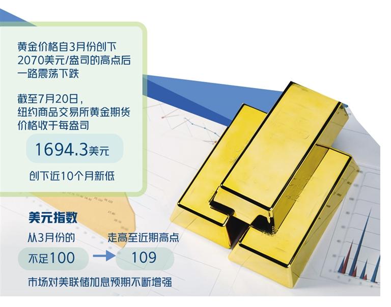 今年以来,受疫情起伏反复、国际地缘政治冲突与美联储货币政策调整等多重因素叠加影响,黄金价格波动明显。自3月份创下2070美元/盎司的高点后,国际金价一路震荡下跌。截至7月20日,纽约商品交易所黄金期货价格收于每盎司1694.3美元,创下近10个月新低。不过,最近几天稍有回升。