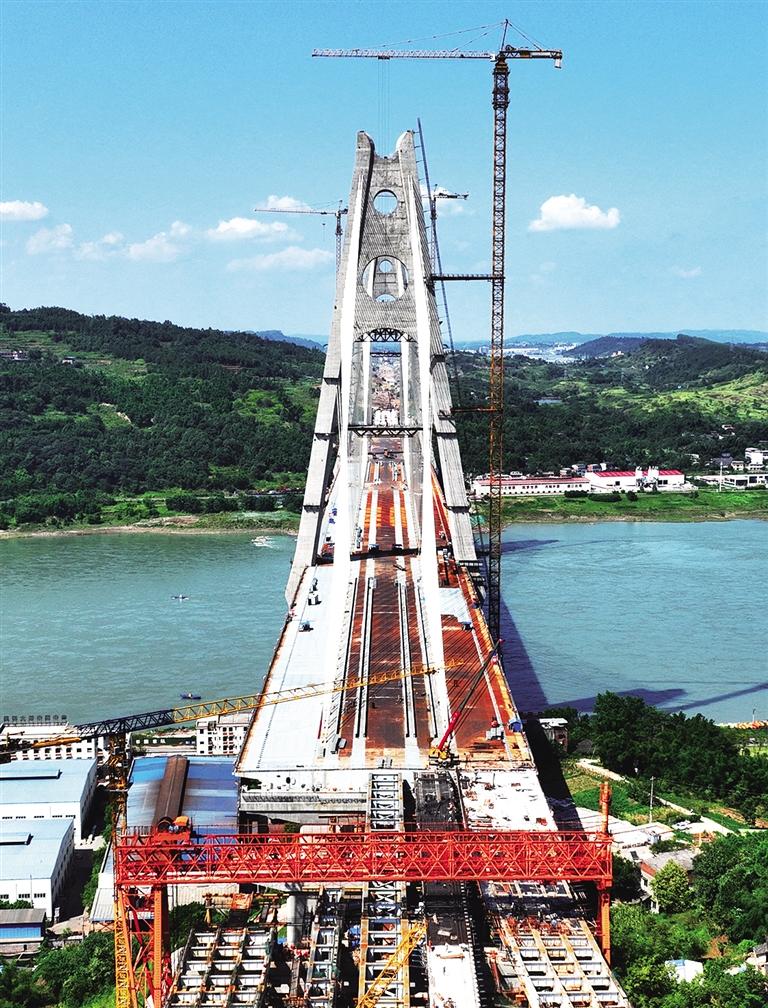 七月二十八日,横跨四川省宜宾三江新区和叙州区的宜宾临港公铁两用长江大桥正在紧张施工。该大桥是新建川南城际铁路与渝昆高铁、蓉昆高铁共同的过江通道,属全线重点控制性工程,建成后将促进川渝两地互联互通,进一步推动川南城市群融入成渝双城经济圈建设,有效缓解宜宾市长江南北两岸通行压力。兰 锋摄(中经视觉)