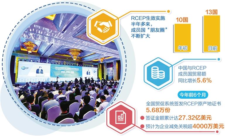 2022年1月1日,RCEP正式生效,标志着全球人口最多、经贸规模最大、最具发展潜力的自由贸易区正式落地。RCEP生效实施半年多来,成员国“朋友圈”不断扩大,从年初的10国“起步”到目前的13国“携手”。成员国间的贸易快速增长。据中国海关最新统计,今年1月份至6月份,中国与RCEP成员国的贸易额同比增长5.6%。今年前6个月,全国贸促系统签发的RCEP原产地证书达5.68万份,签证金额累计达到27.32亿美元,预计为企业减免关税超过4000万美元。